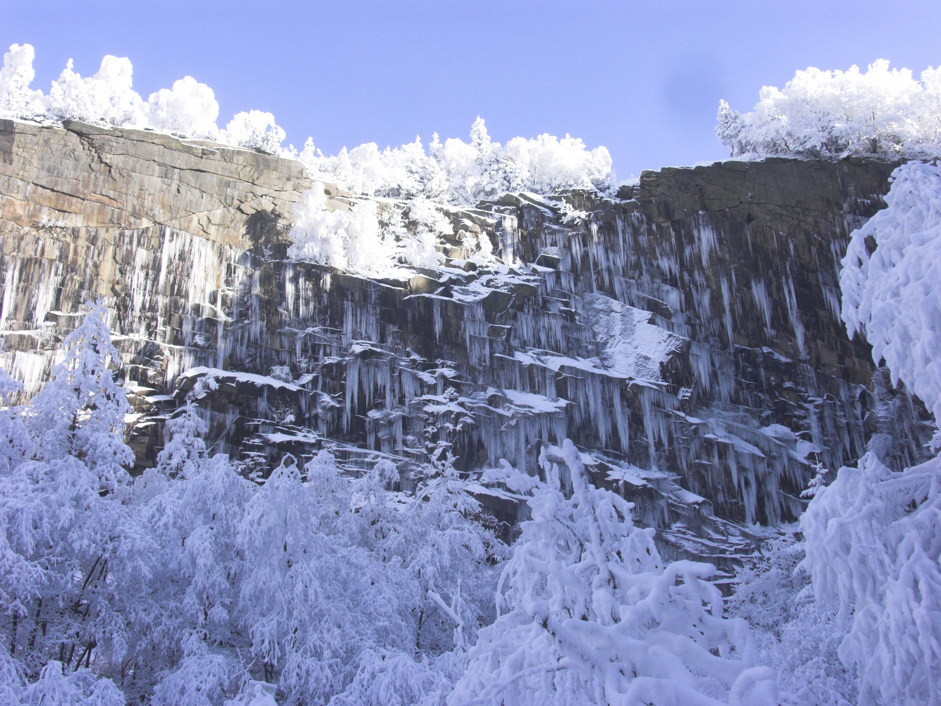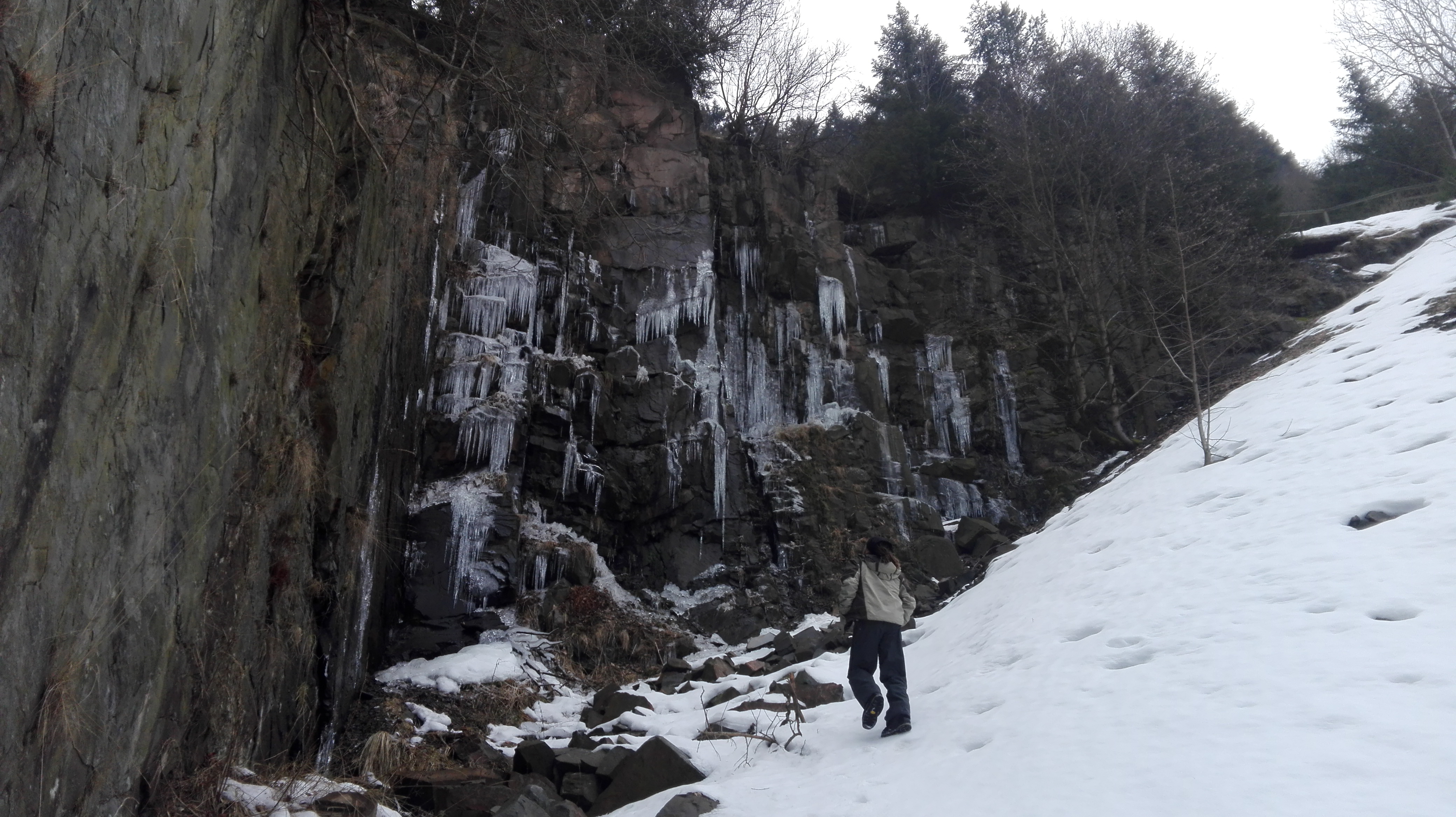 Da hat uns doch eine Wetterlage wie damals 1978/79 ereilt! Dreißig Zentimeter Neuschnee auch im Flachland, dazu Temperaturen von -10°, ebenfalls im Flachland. Da müßten doch auch mal die tiefer gelegenen Steinbrüche und Wasserfälle zufrieren. Also mal schauen fahren! Crux war allerdings, das Auto freizuschaufeln.