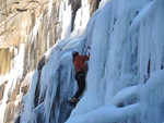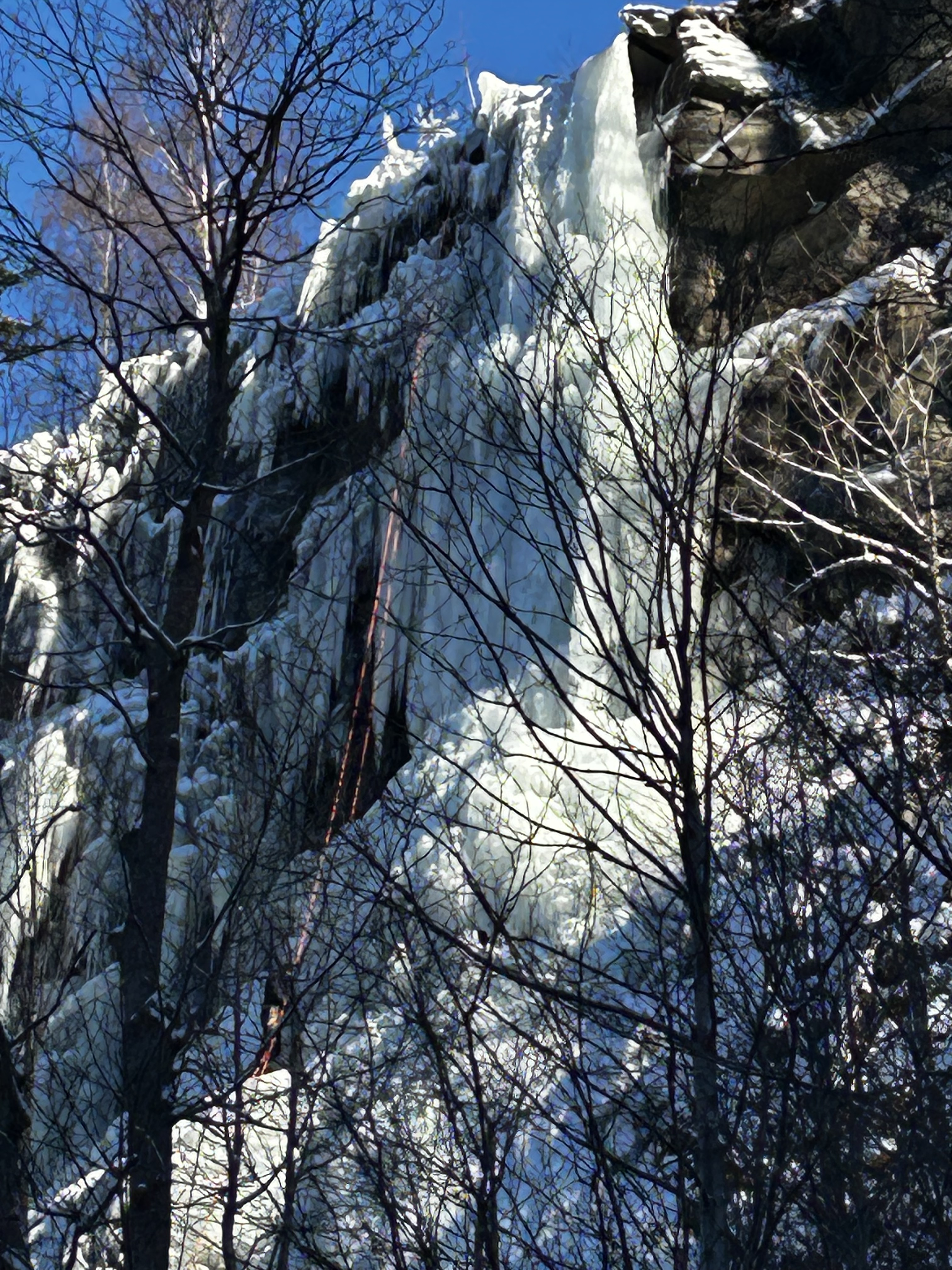 In der Tat ist das Eis gewachsen, mir wärs aber noch zu wenig gewesen. Aber ein Hamburger Pärchen mit einem Gast aus der Karibik(!) vergnügten sich im Toprope. Aber es soll kalt bleiben, da erwarte ich nächstes Wochenende Hochbetrieb! Allerdings dürfte früher Beginn sinnvoll sein. Aufgrund der schönen Sonne steigen die Temperaturen am Nachmittag an die Null Grad und dort wo die Sonne hinscheint (besonders im linken Wandteil) fällt reichlich Eis runter.