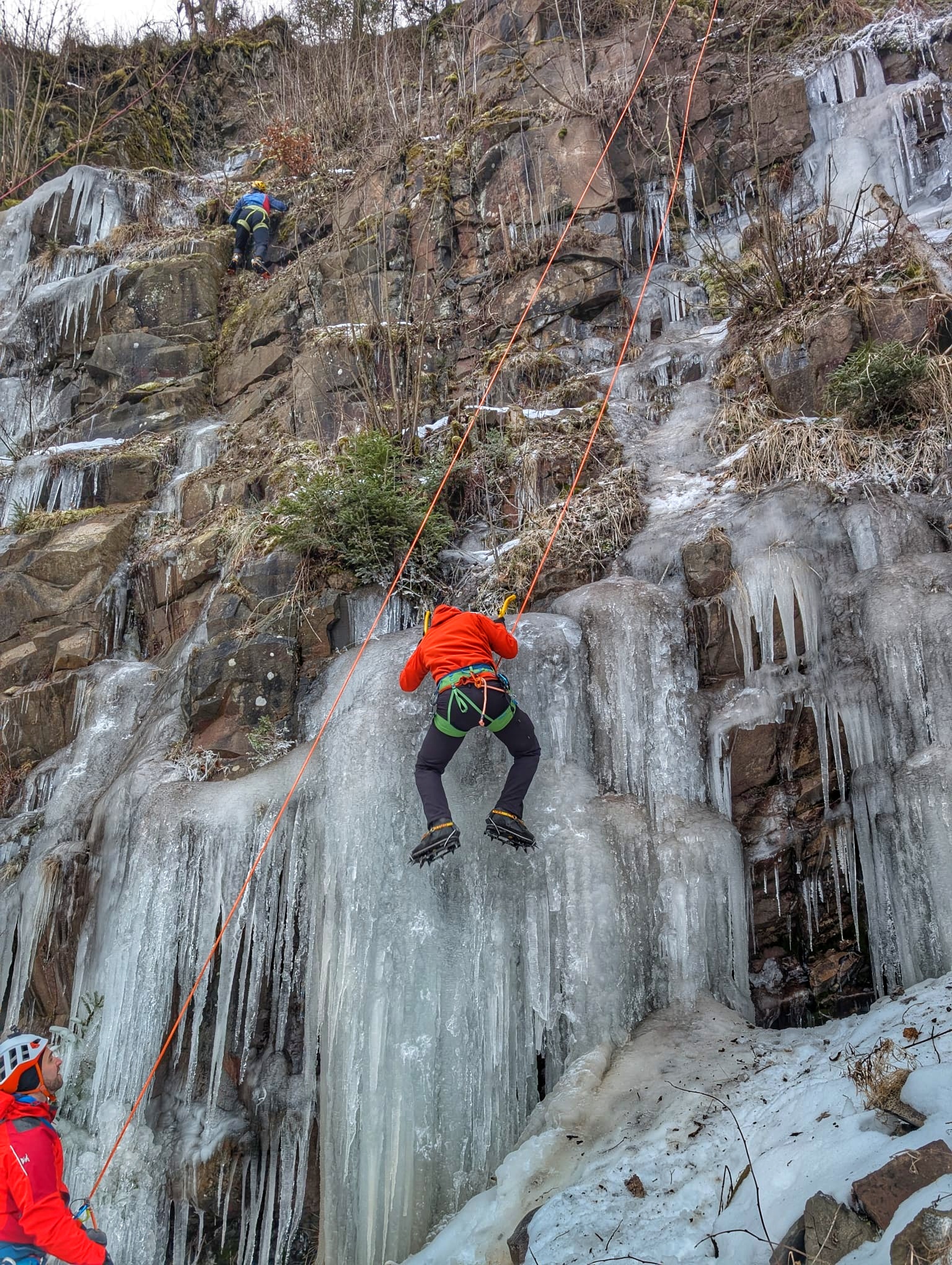wir waren Heute Eisklettern am Romkerhaller Wasserfall.Die erste, kleinere Stufe unten geht super, dort ist es trocken und wir konnten dort mindestens fünf kürzere, aber trotzdem interessante Wege gehen.Am Hauptfall (oberer Teil) hat sich eine Menge schönes Eis gebildet, allerdings kommt dort noch sehr viel Wasser runter. Ganz links haben wir dort eine Linie gemacht. Allerdings wird man dort durch Sprühwasser ein Bisschen nass und noch ein Bisschen mehr, wenn eine Windbö aus der falschen Richtung kommt ;-)Außerdem haben wir uns den Lauthental Steinbruch angeschaut, dort ist inzwischen auch etwas Eis vorhanden.