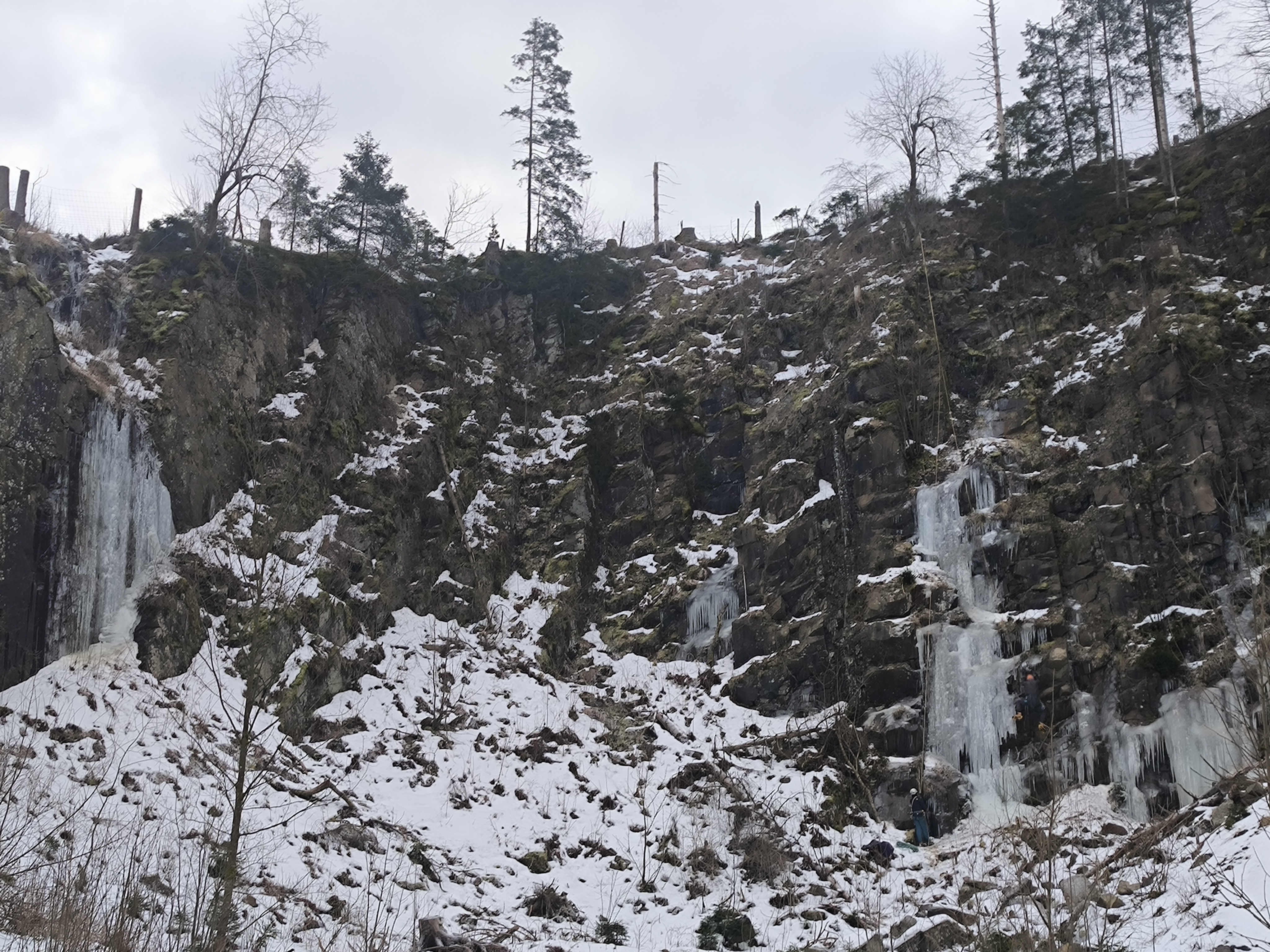 Die Woche war es tatsächlich kalt. Im Harz herrscht eine Inversionswetterlage. Im Tal neblig und kalt, über dem Nebel deutlich wärmer. Der Wurmbergsteinbruch liegt noch in der Nebelzone, da ist das Eis tatsächlich gewachsen. Auch am Romkerhaller Wasserfall bildet sich Eis.