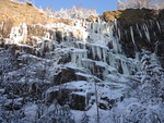 Nur -5° am Wasserfall. Entsprechend flüssig sieht er immer noch aus. Trotzdem war ein Päarchen zugange. Anfänger, wie sie selber sagten. Und nur mit einem arg kurzen 20m Hallenseil ausgerüstet :-(