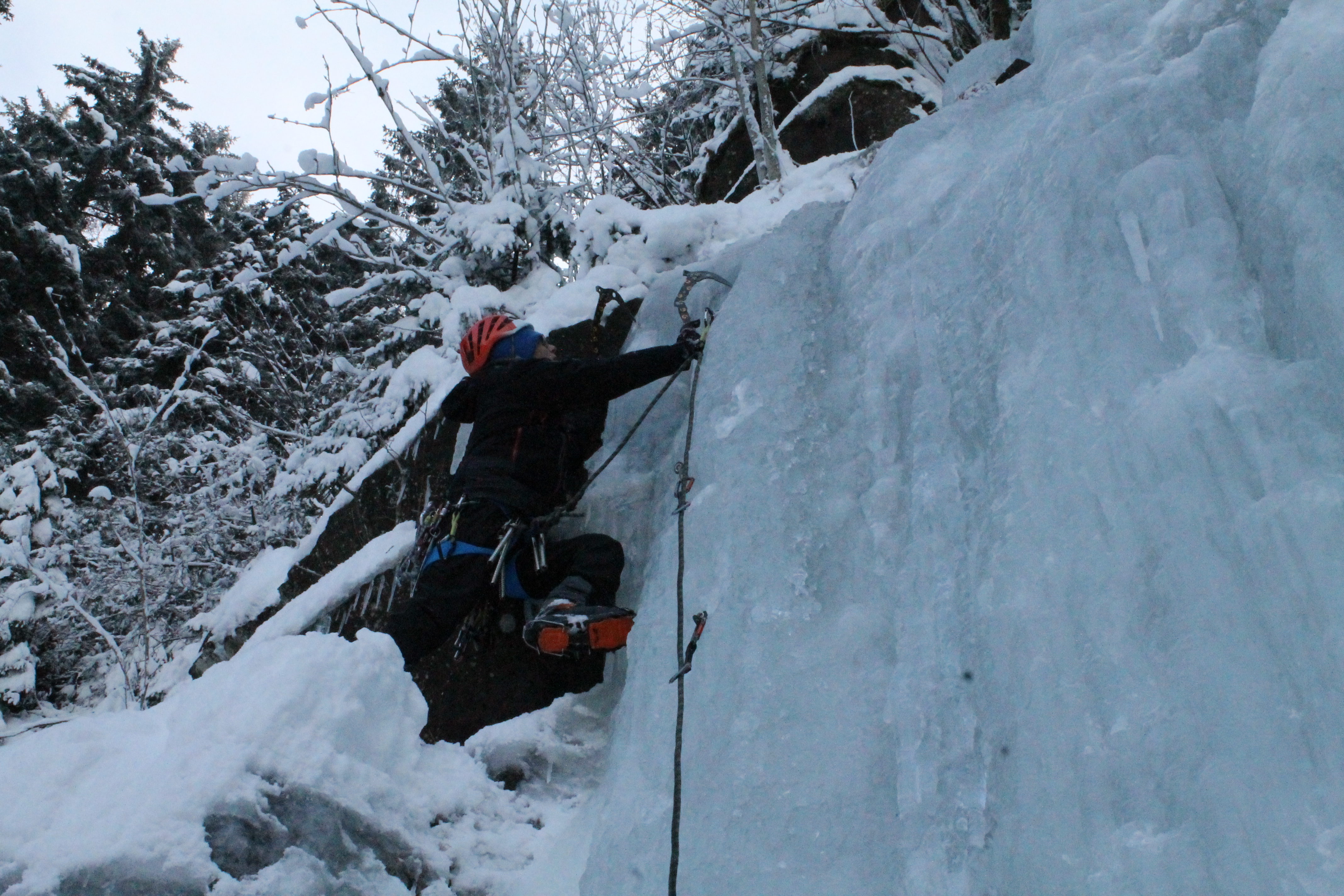 Bluhmkohleis WI3 bis Base vom Saule, Ein Schlinge an die grosse saule 2 schrauben platziert bis circa 8m hohe ....Lieder kamm ein Toprope in gesicht als wir die Öberer saule ging dass ich zu Rechten kante Ausweichen mussen und in die fels einstieg (Weil die Eis auf die rechten seite so viel luft und Sprude war (Wie glass) und so BASS..... dass ganze kamm verdammt instabil Vor!