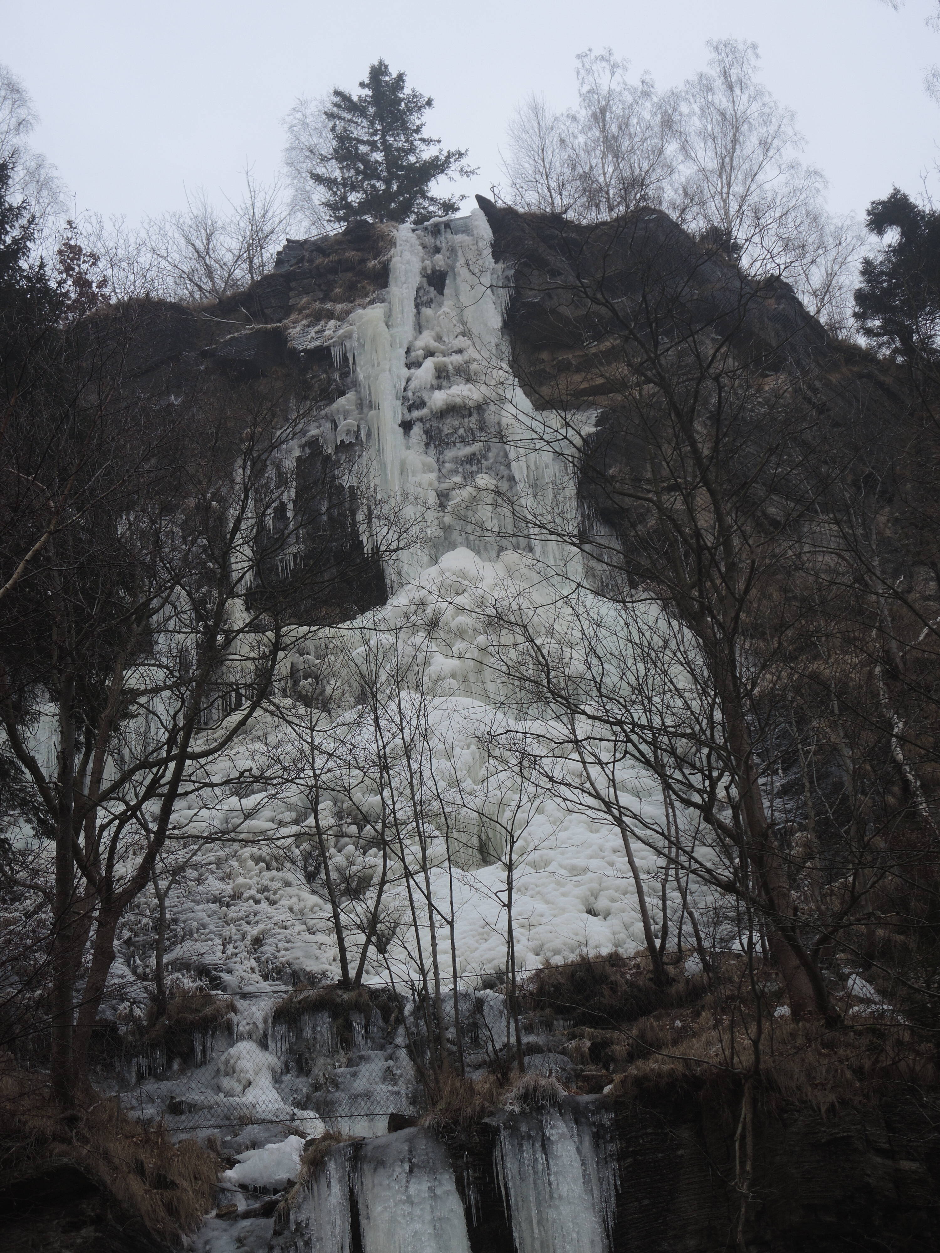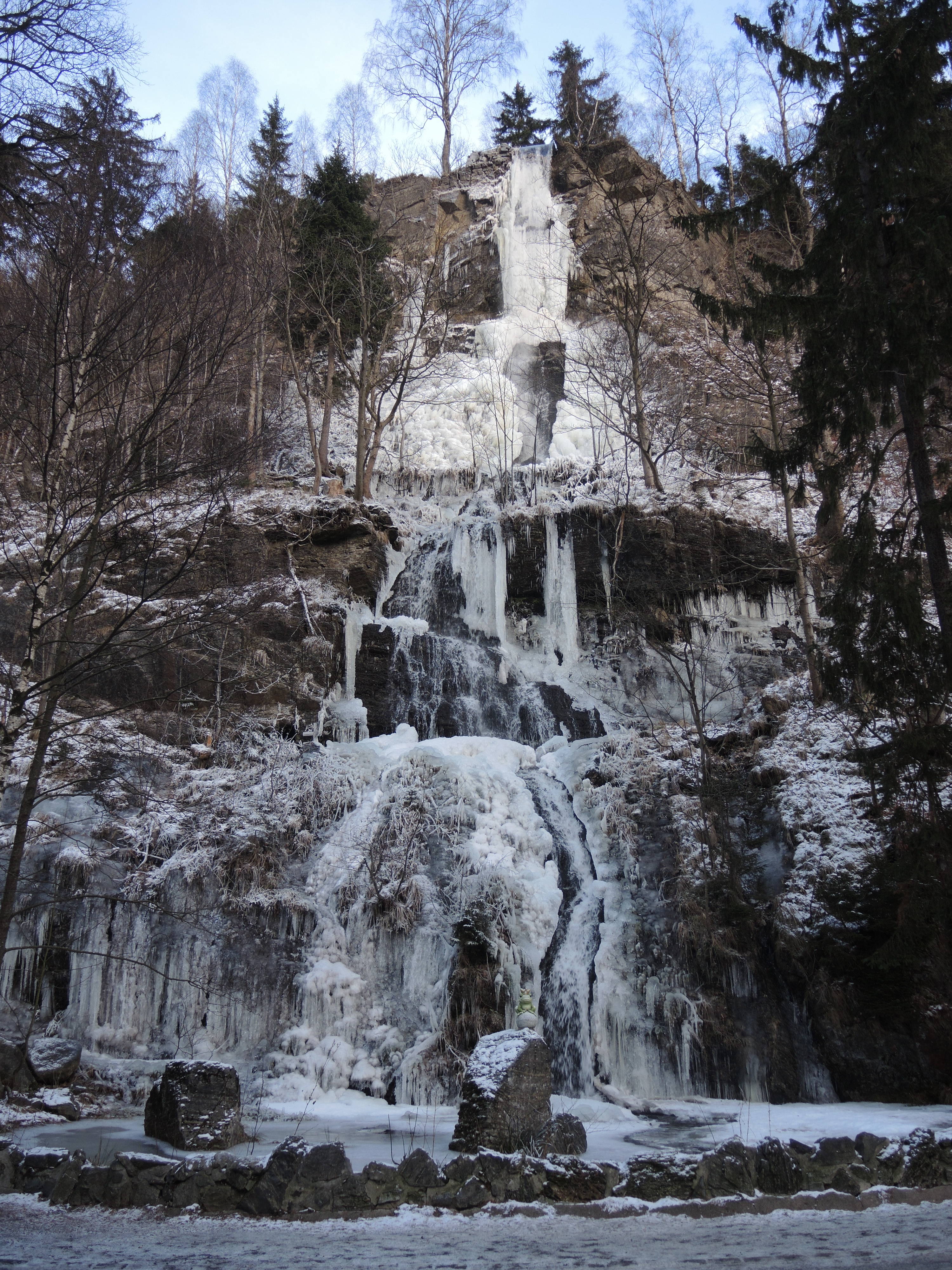 Das Thermometer an meinem Fenster zeigte heute morgen -19°! Als ich losfuhr warens noch -10°, in Romkerhalle nur noch -6°. Trotzdem ist der Wasserfall schon recht gut.