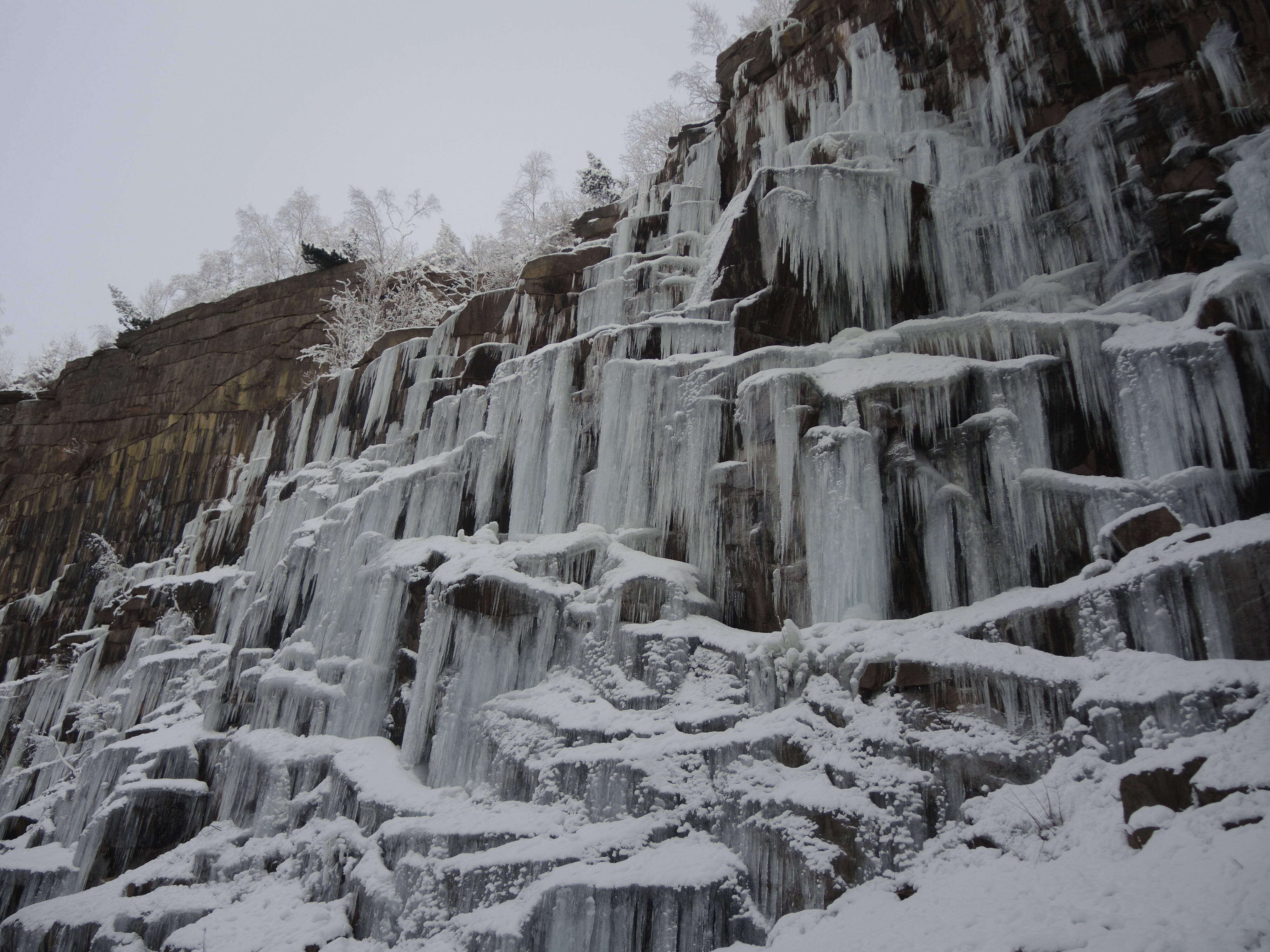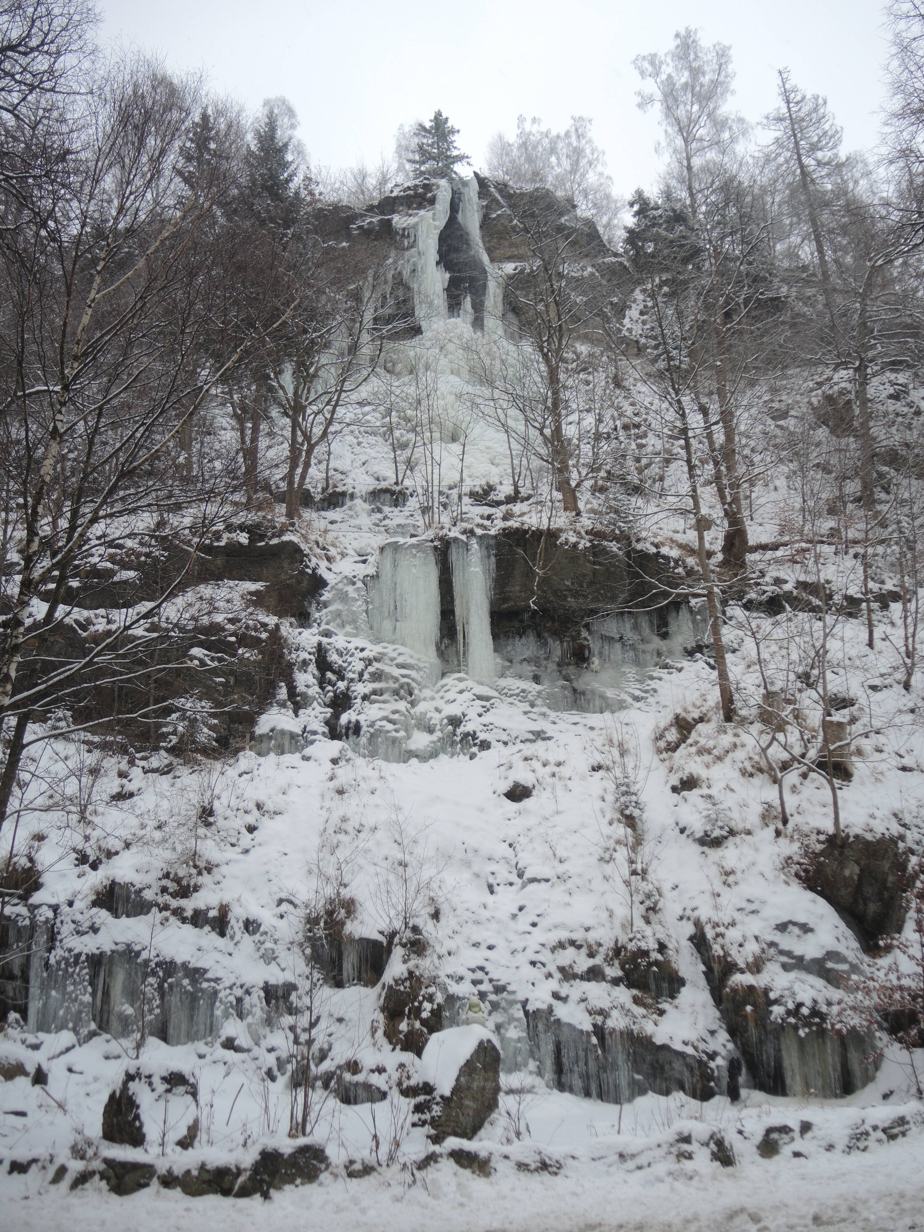 Da hat uns doch eine Wetterlage wie damals 1978/79 ereilt! Dreißig Zentimeter Neuschnee auch im Flachland, dazu Temperaturen von -10°, ebenfalls im Flachland. Da müßten doch auch mal die tiefer gelegenen Steinbrüche und Wasserfälle zufrieren. Also mal schauen fahren! Crux war allerdings, das Auto freizuschaufeln.